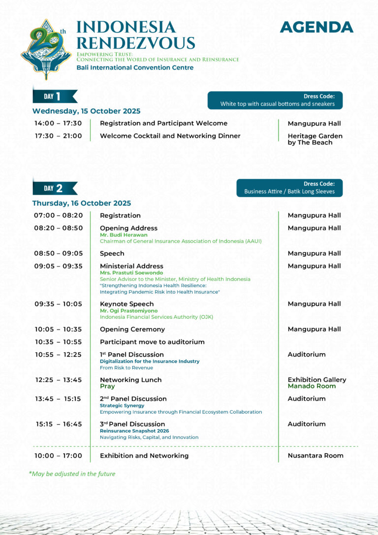 Welcome to Indonesia Rendezvous 2025. Trust is essential to business, economic and societal development. It is needed now, in this complex and interconnected world. We are also living in constantly changing environment which lead us into uncertainty and unpredictable world. During unstable times, insurance provides stability and predictability. While reinsurance will take us into another level. In this term, insurers and reinsurers play vital role as trusted partners for the business, government and society to navigate the uncertainties.