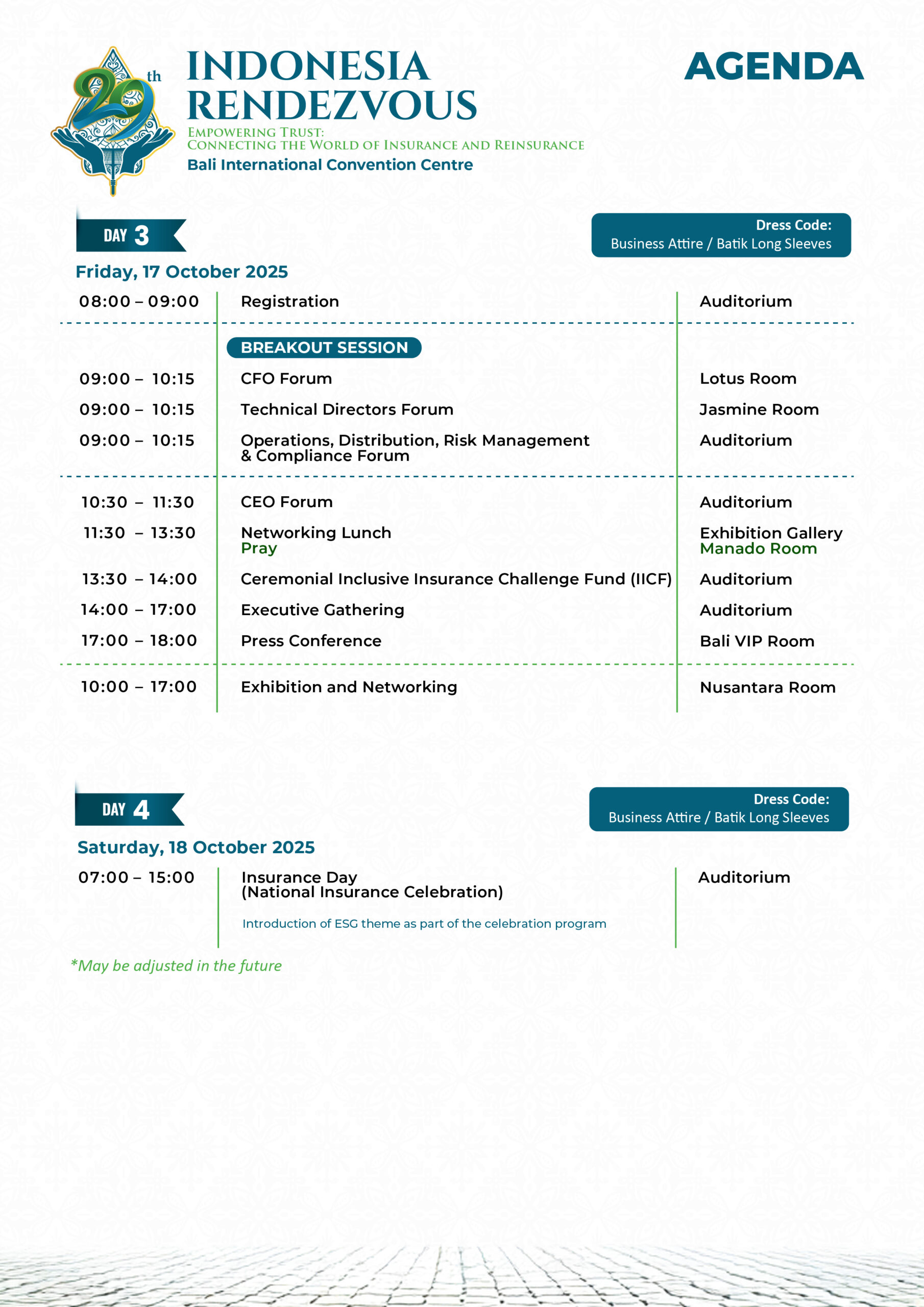 Let us come together in the spirit of trust and collaboration to thrive our industry ecosystem globally. We are inviting and waiting for you in magnificent Nusa Dua, Bali, to harvest ideas, opportunities and hand-shake partnership in one of the most significant calendars of our industry in the region. Set the date on your agenda for the 29th Indonesia Rendezvous. It is the time to EMPOWERING TRUST: CONNECTING THE WORLD OF INSURANCE & REINSURANCE.